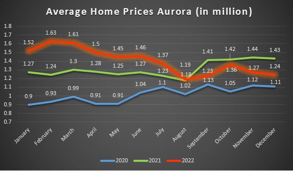 The average home price in Aurora dropped from $1,633,259 in February to $1,191,994 in August and has since balanced out. The December average was $1,239,509, which is 13% lower than one year ago. The current price level is comparable to prices that we've seen in the first half of 2021.