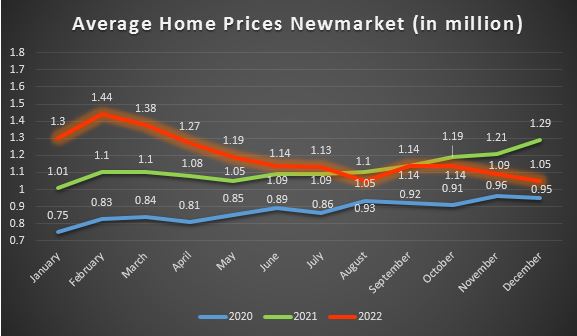 In Newmarket the peak was also reached in February when the average price climbed to $1,444,858 and then came down to $1,051,080 in August - and that's pretty much where prices still were in December (-19% year-over-year).