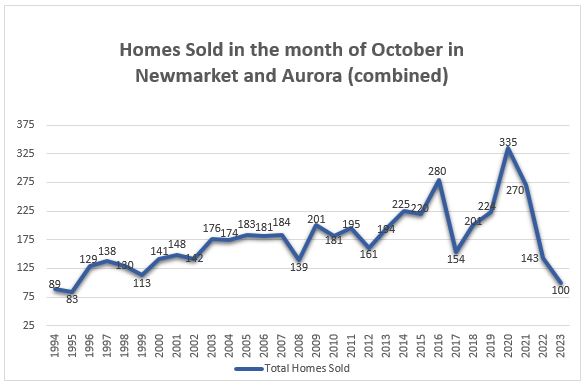 In Aurora and Newmarket a combined 100 homes have sold. Last time less than 100 sales in those two Towns were reported was also in 1995.