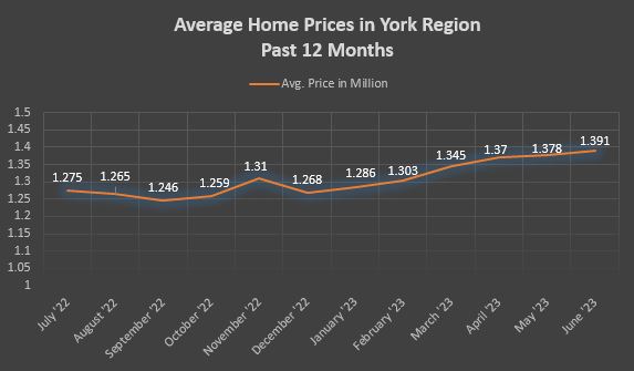 The average price in York Region of $1,391,215 was up by 1% compared to May. But while 1702 homes have sold in May, only 1302 sold in June (-23.5%). On a year-over-year basis the prices were 6.4% higher than 12 months ago.
