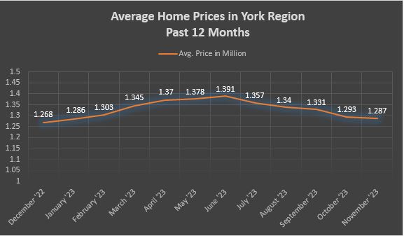 As for York Region, the average price came down slightly compared to the previous month and sits now at $1,286,617. That reflects a 1.75% decrease on a year-over-year basis.