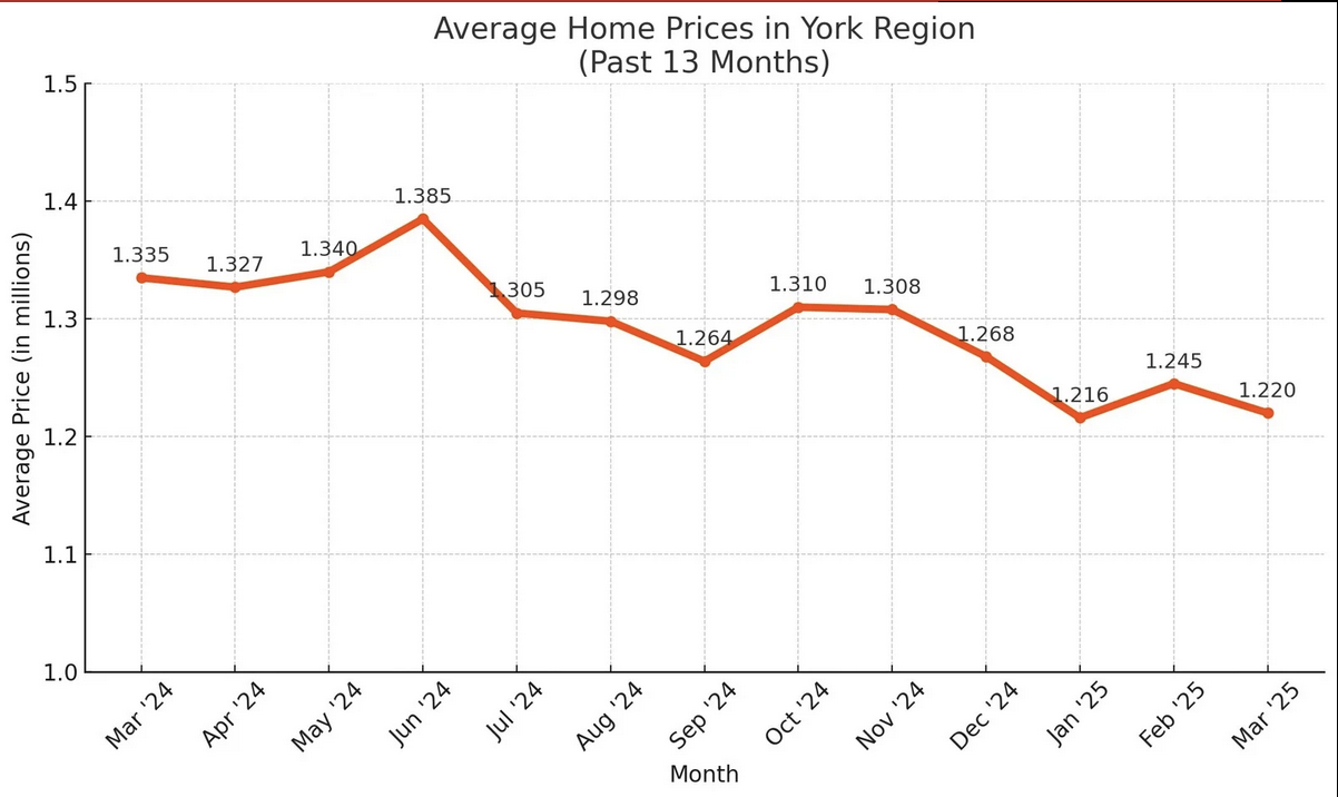 The average home price in York Region was $1,220,124 - 31.3% less than in 2024 ($1,334,655). On a positive note, there have been more homes sales in March (859) than in February (737).