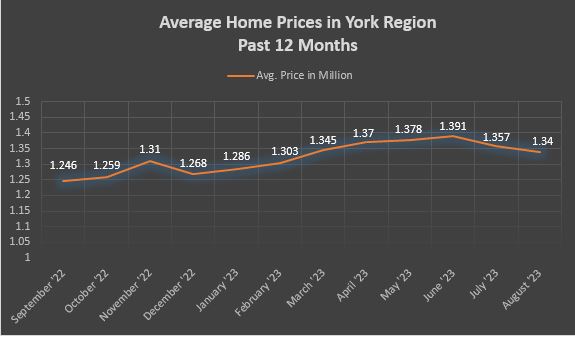 I hope your summer is going great. Real Estate prices in August remained at a high level. The average price in York Region was $1,339,742 which is 5.85% higher on a year-over-year basis and only slightly lower compared to July. Aurora and Newmarket saw the biggest growth in the past 12 months in all of York Region.