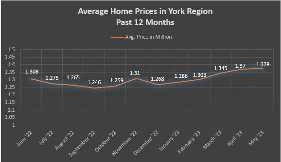 Prices in York Region have increased for the fifth month in a row. The average price in May was $1,377,590 - that reflects an increase of 8.7% since December.