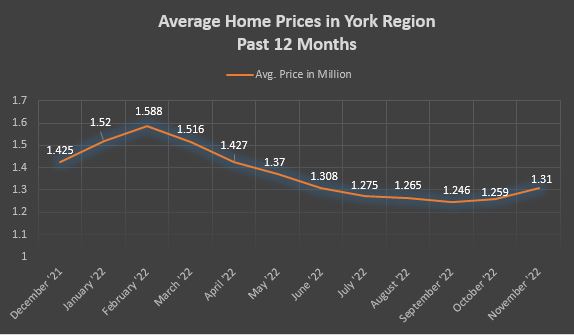 After four months of stable prices, there hasn't been much of a change in November. In some areas of York Region prices have dropped a little but all together the prices have remained steady or even slightly gone up. The average home price in York Region in November was $1,309,646 (October: $1,258,610). On a year-over-year basis prices in the Region are 6% down.